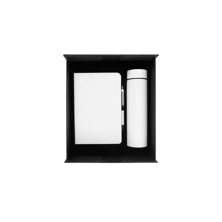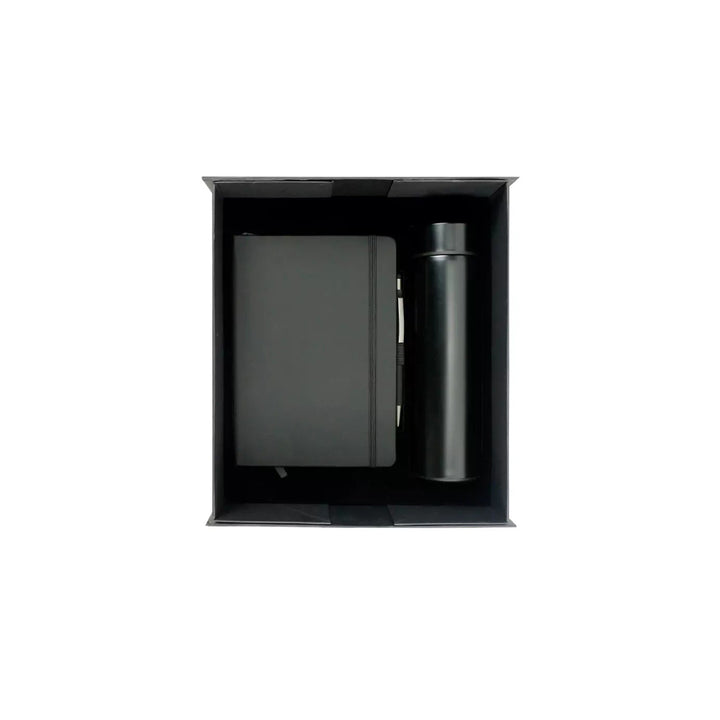 - Included: 1. Notebook with Pen Holder in A5-sized, PU leather, 70g Ruled Paper, and 96 sheets. | 2. Stylus Metal Pen. | 3. Smart Temperature LED Display Bottles.